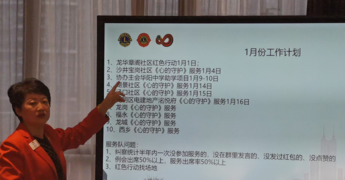 队长李欣鸿狮姐对12月份的工作进行了总结。12月开展了多项服务活动,如12月10日《心的守护》走进桃园社区(桃园服务队协办)、12月5日河婆中学宿舍修缮改造、12月12日《心的守护》走进福南社区以及红色行动启动仪式、12月14日华狮节、12月16日《心的守护》走进松岗潭头社区(松岗服务队协办)、12月23 - 25日协办大连导盲犬项目、12月27日《心的守护》走进沙井辛养社区、12月28日《心的守护》走进福田上沙社区、12月13日山海相依秦鹏交流、12月19 - 21日领导力培训、12月11日例会等。同时,也提出了服务队存在的问题,并且提到新一届队长团队3月份选举,希望有意愿担当的狮友在2月1日前报名参加选举。